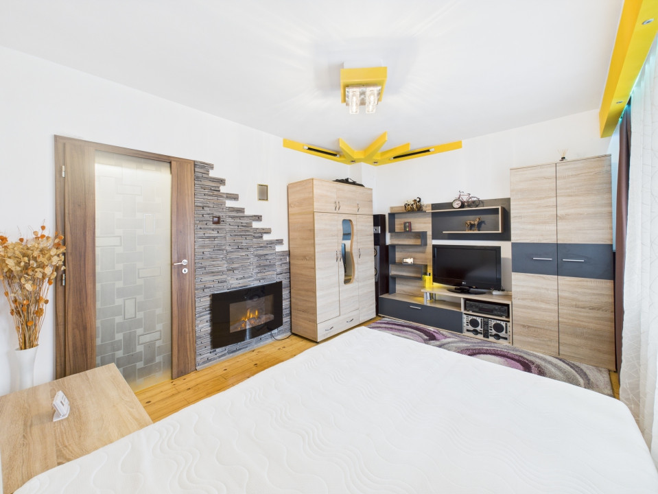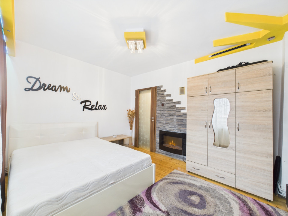 - Cameră de zi luminoasă, dotată cu pat matrimonial cu saltea premium cu spumă cu memorie și Aloe, asigurând un somn odihnitor