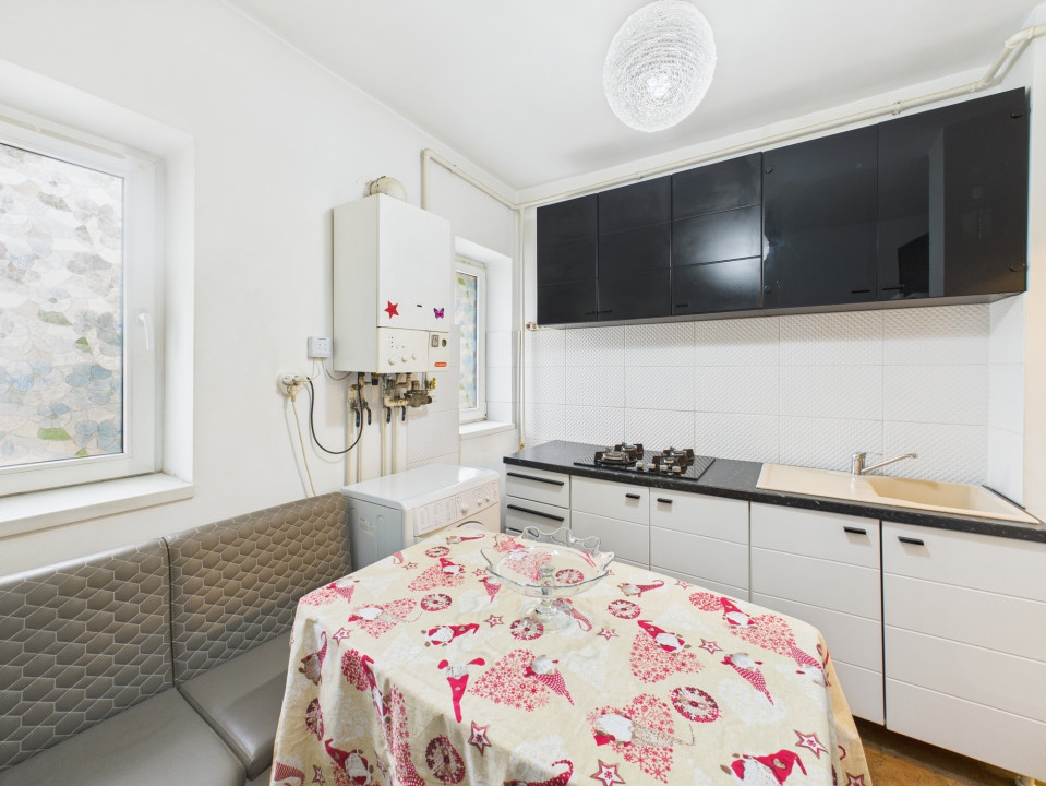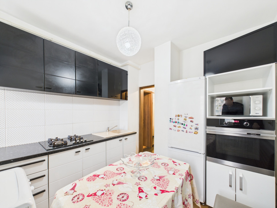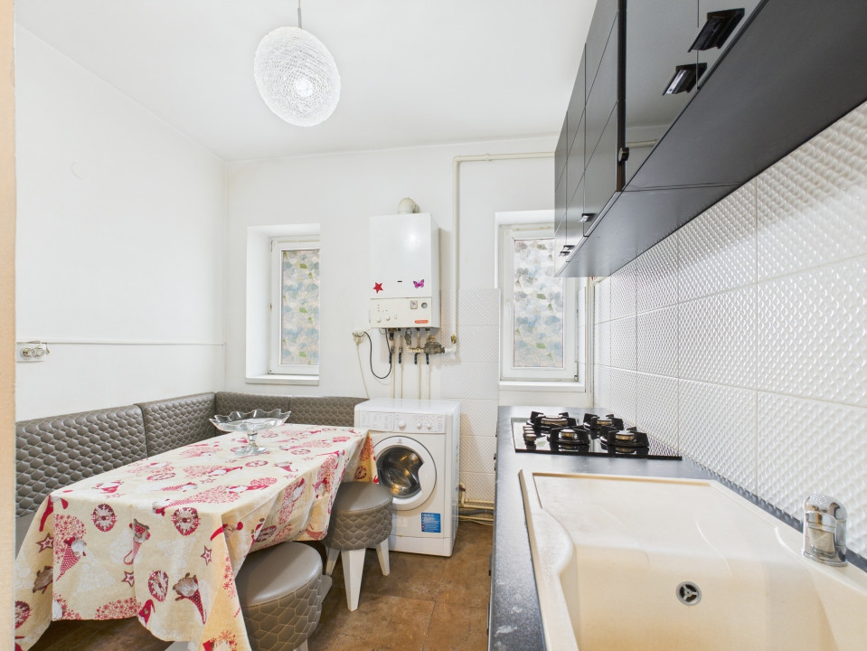 - Bucătărie complet mobilată și utilată, echipată cu plită pe gaz, cuptor electric, cuptor cu microunde, frigider și mașină de spălat rufe