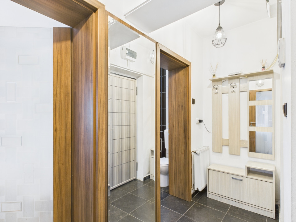 - Debara/dressing – spațiu versatil cu rafturi de depozitare și uscător de rufe, ce poate fi reorganizat în funcție de preferințe