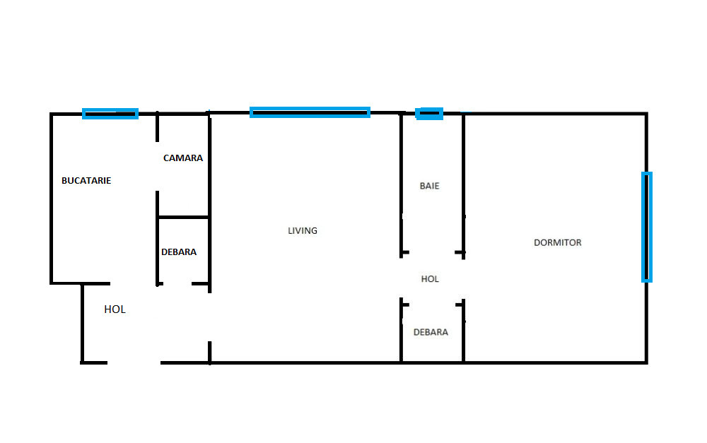 Apartamentul are o suprafata utila de aproximativ 48 mp si este compus din: camera de zi, dormitor, bucatarie, 2 holuri, 2 debarale si camara. Fiind la parter, nu dispune de balcon.