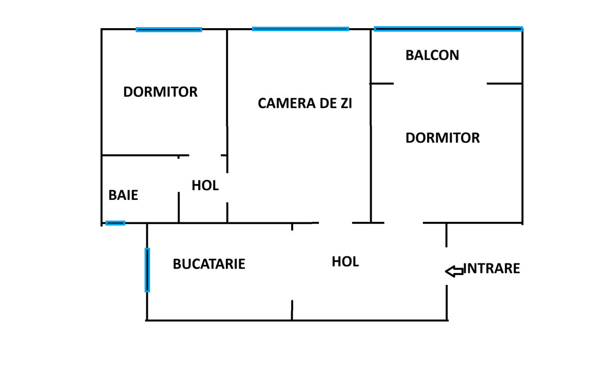 Apartamentul are o suprafata utila de aproximativ 60 mp + un balcon ( a fost extins unul dintre dormitoare), avand o structura circulara.