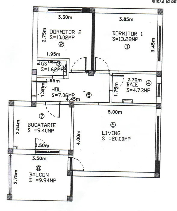 Apartamentul are o structura decomandata, cu o suprafata utila de 66 mp + balcon, fiind compus din: camera de zi, 2 dormitoare, bucatarie, hol, baie( cu geam), grup sanitar si balcon( pe balcon a fost amenajata o debara - spatiu de depozitare).