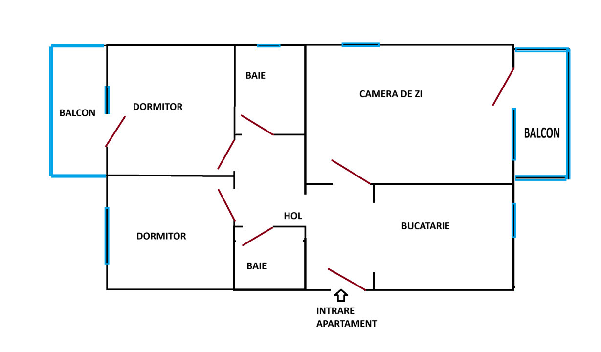Apartamentul are o structura decomandata, cu o suprafata utila de aproximativ 75 mp + 2 balcoane. Este compus din: camera de zi, 2 dormitoare, o bucatarie, hol, 2 bai si 2 balcoane.