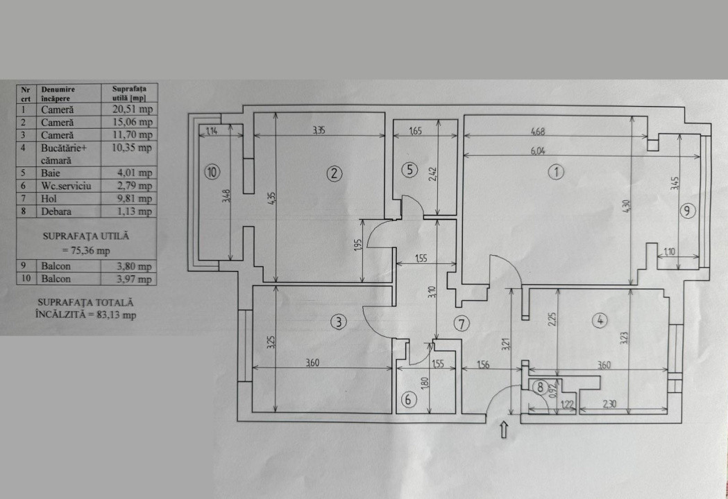 Apartamentul are o suprafata utila de 75.4 mp + 2 balcoane ( au fost extinse camera de zi si un dormitor). Este compus din: camera de zi, 2 dormitoare, bucatarie, hol, 2 bai, debara.