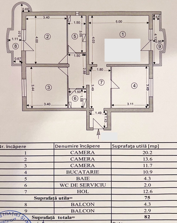 Apartamentul are o suprafata utila de 75 mp + 2 balcoane. Este compus din: camera de zi, 2 dormitoare, bucatarie, hol, 2 bai si 2 balcoane.