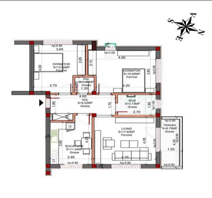 Are o suprafata utila de 74 mp + un balcon de 6 mp, fiind compus din: camera de zi, 2 dormitoare, o bucatarie generoasa, hol, o baie si o debara.