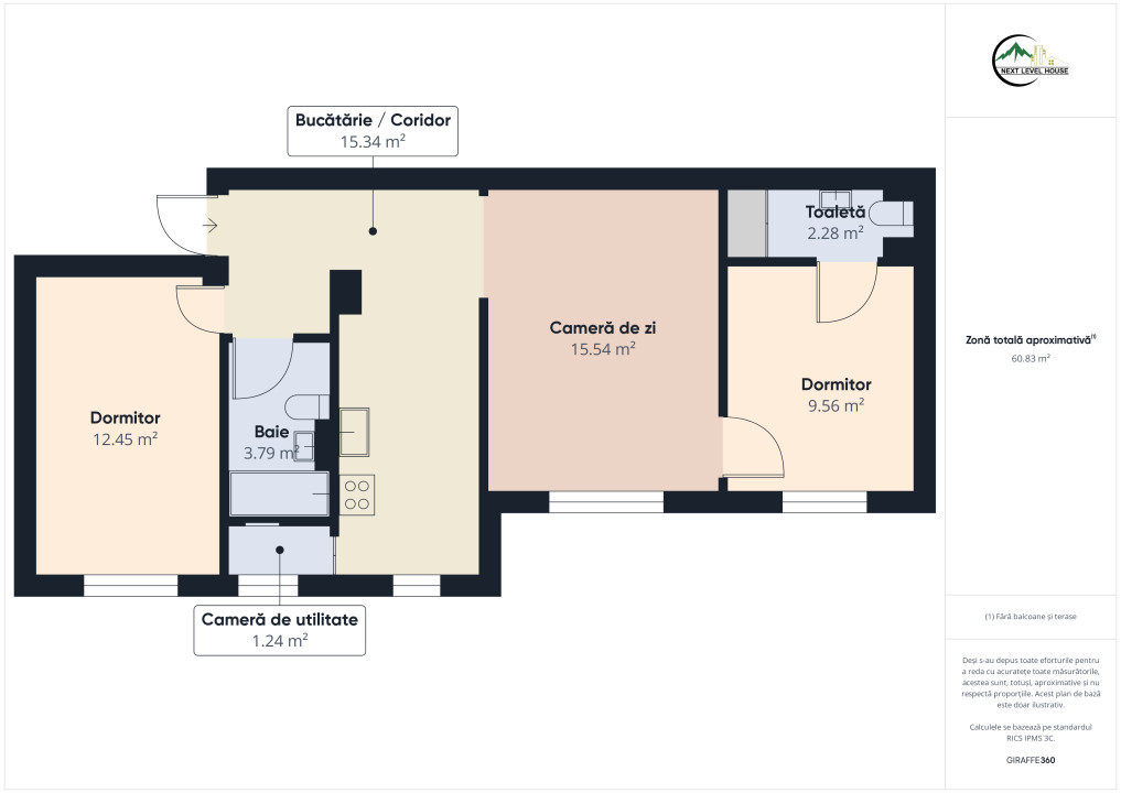 Băi: 2 (o baie principală cu cadă și un grup sanitar unde se poate amenaja un duș)