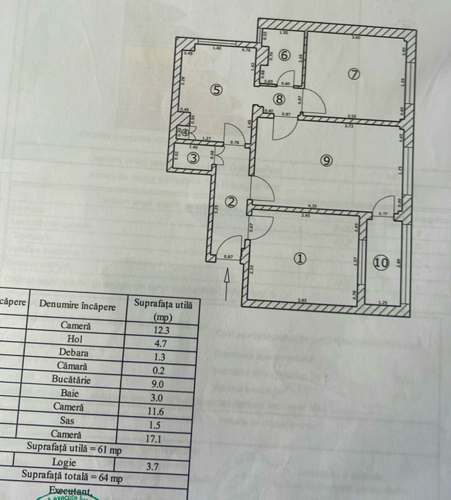 Apartamentul are o suprafata utila de 61 mp + un balcon de 3,7 mp. Este compus din: camera de zi, 2 dormitoare, bucatarie, 2 holuri, baie si balcon