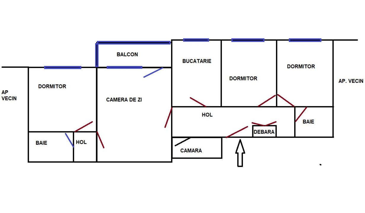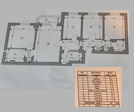 Apartamentul are o suprafata utila de 81 mp + un balcon( 3 mp) si este compus din: camera de zi, 3 dormitoare, bucatarie, 2 holuri, 2 bai, camara, debara si balcon.